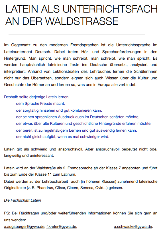 Latein, eines der ältesten Schulfächer in Deutschland und in Europa, wird am Gymnasium Waldstraße von fünf Kolleginnen und Kollegen unterrichtet: Frau Schwacke, Frau Fuhg, Herrn Augsburger, Herrn Kalde und Herrn Kreter.