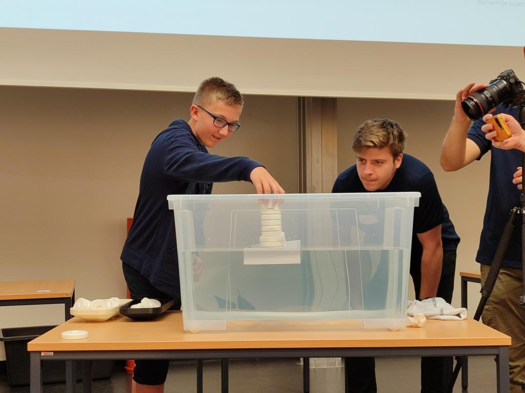In der schwierigen Kategorie traten Noah (10a), Flo (6a), Lukas (8c) und Niklas (9c) gemeinsam an und holten den ersten Platz. Hier war die Aufgabe, einen Tauchkörper zu konstruieren, der in einem ein Meter langen Rohr abtaucht und nach genau fünf Sekunden wieder an die Wasseroberfläche zurückkehrt. Das erforderte viel technisches Geschick und ein gutes Verständnis für Auftrieb und Gewichtskraft.