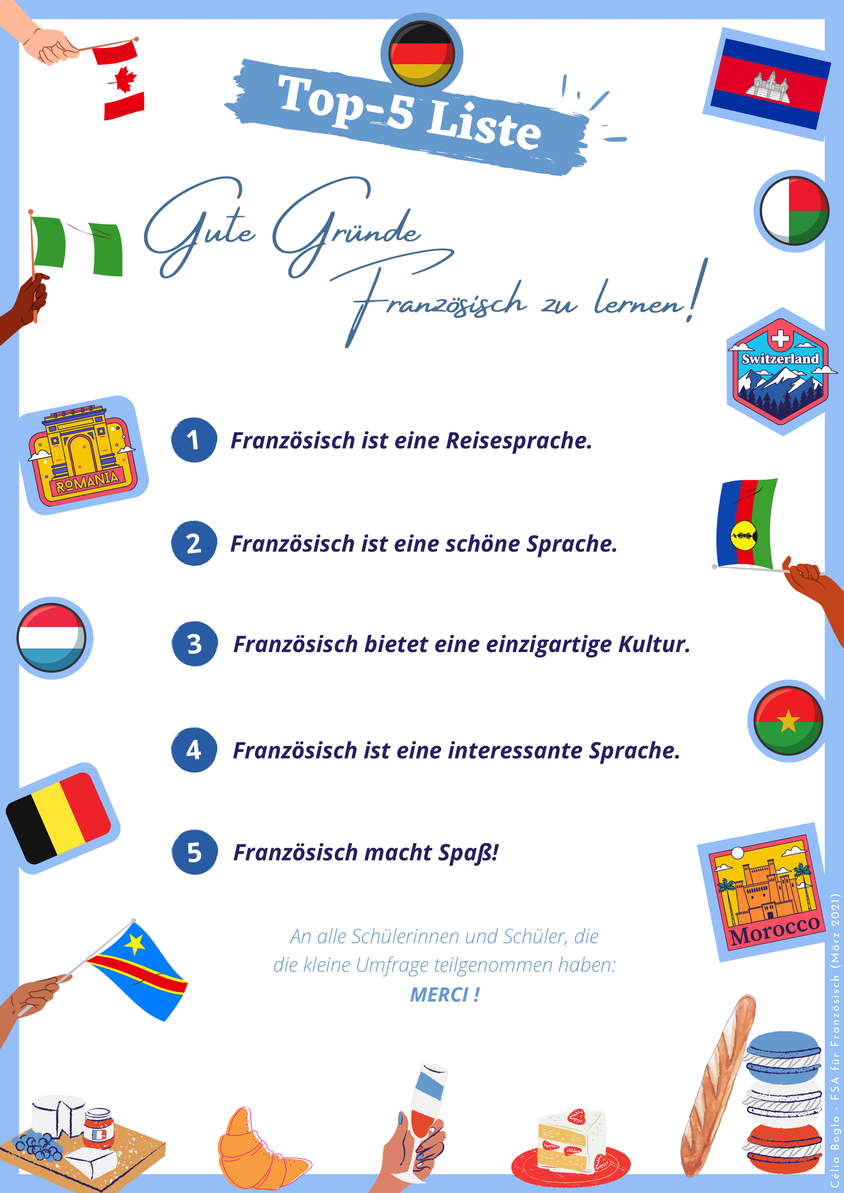 Bei dieser Gelegenheit - und dank der Teilnahme mehrerer Schülerinnen und Schüler an einer kleinen anonymen Umfrage - habe ich eine „Top-5-Liste“ zum Thema „Gute Gründe Französisch zu lernen“ erstellt.