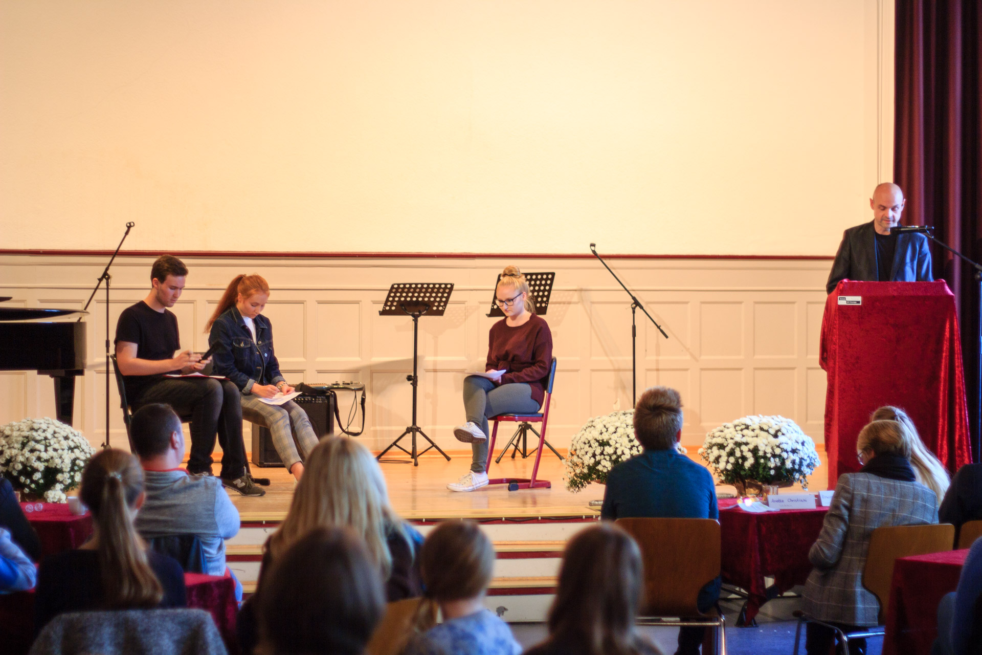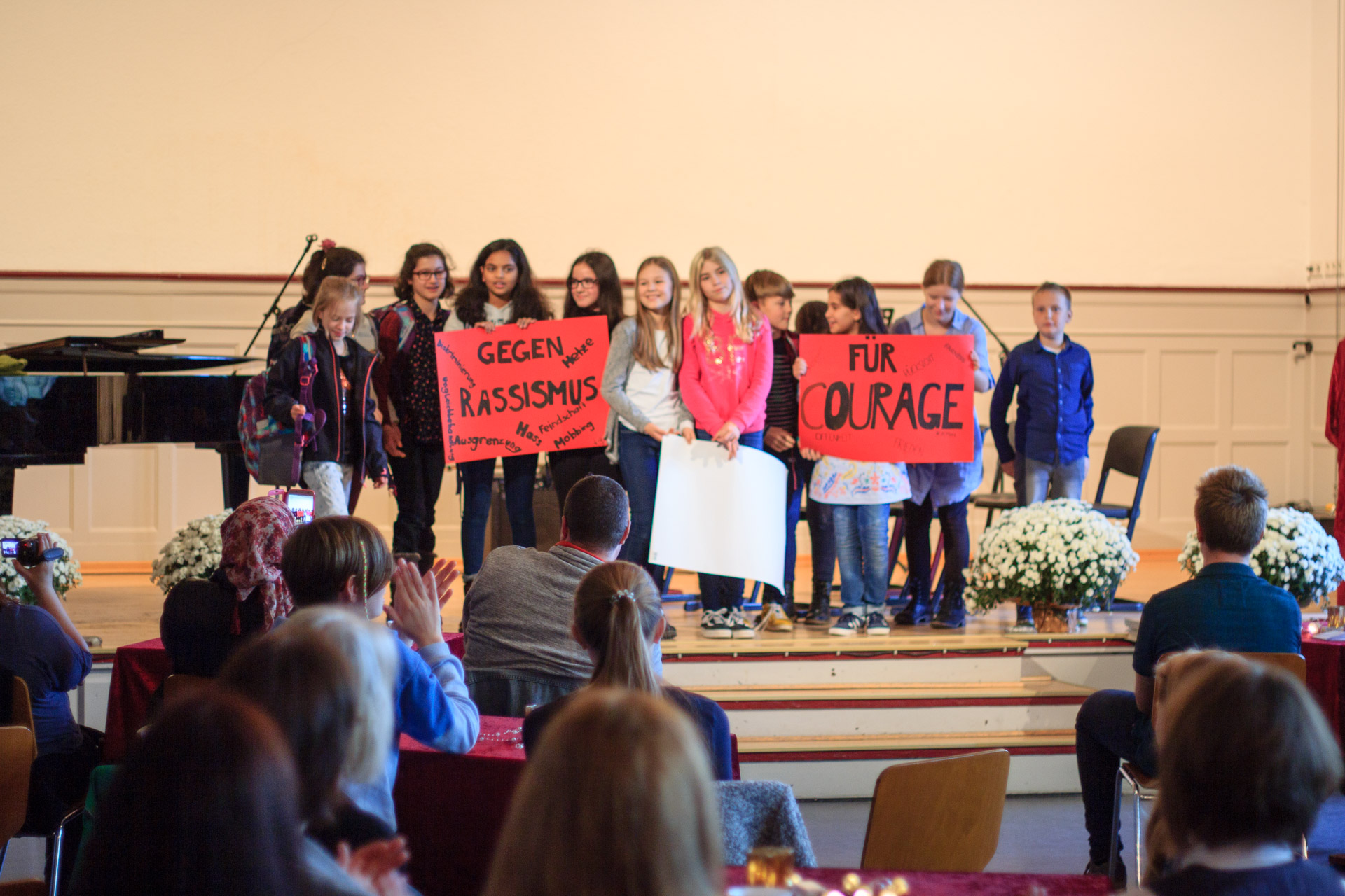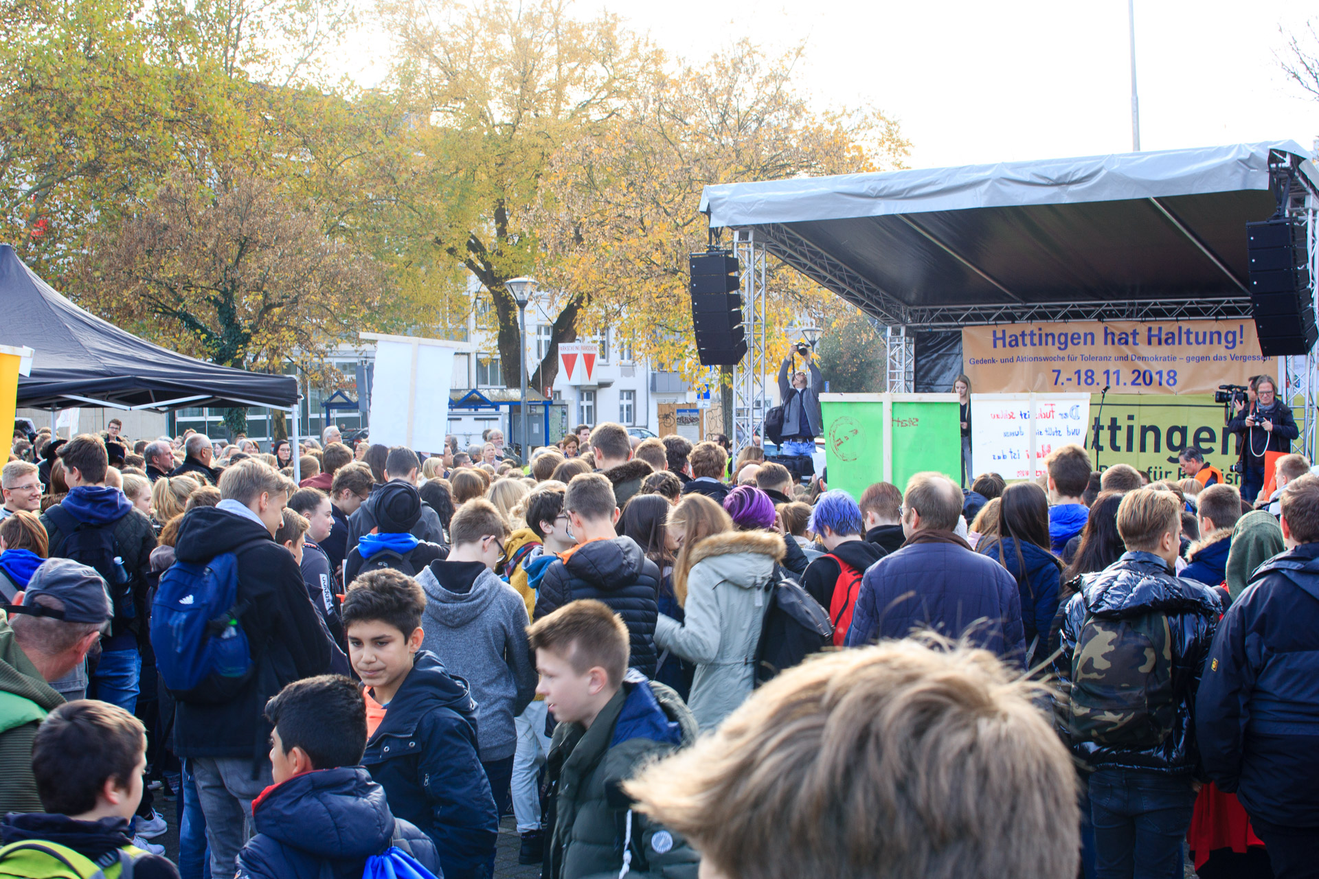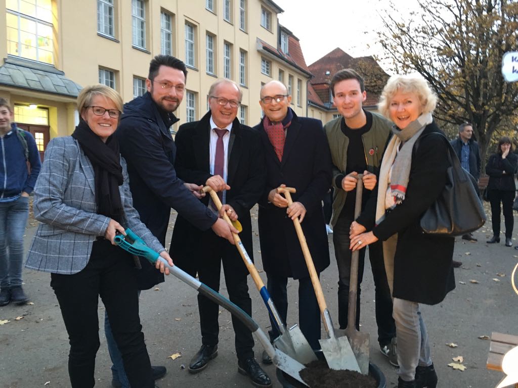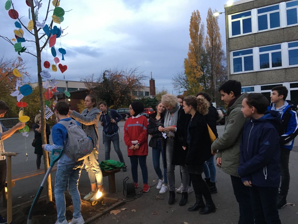 Die Theater-AG sensibilisierte mit ihrem Stück „Die Täuschung“ für Alltagsrassismus in unserer Gesellschaft und forderte mehr Mut und Zivilcourage. Der Zusatzkurs des Abiturjahrgangs präsentierte fiktionale Tagebucheinträge zum 9. November 1938, durch welche die Gefühls-und Gedankenwelt von Opfern und Tätern erfahrbar wurde. Der Geschichts-Leistungskurs der Q1 und Mitglieder des Orchesters schafften es in einer szenischen Lesung nicht nur die Originalquellen der Hattinger Reichspogromnacht in Ihrem Ausmaß und Schrecken spürbar zu machen, sondern würdigten durch Einbettung in gefühlvolle Klezmermusik die deutsch-jüdische Kultur. Das Café endete mit der symbolischen Pflanzung eines Amberbaums, der von nun als ein Symbol des Friedens wachsen soll. Der Praktische-Philosophie-Kurs der 9er-Klassen forderte die Gäste auf ihre Wünsche und Gedanken zum Frieden in den Baum zu hängen.