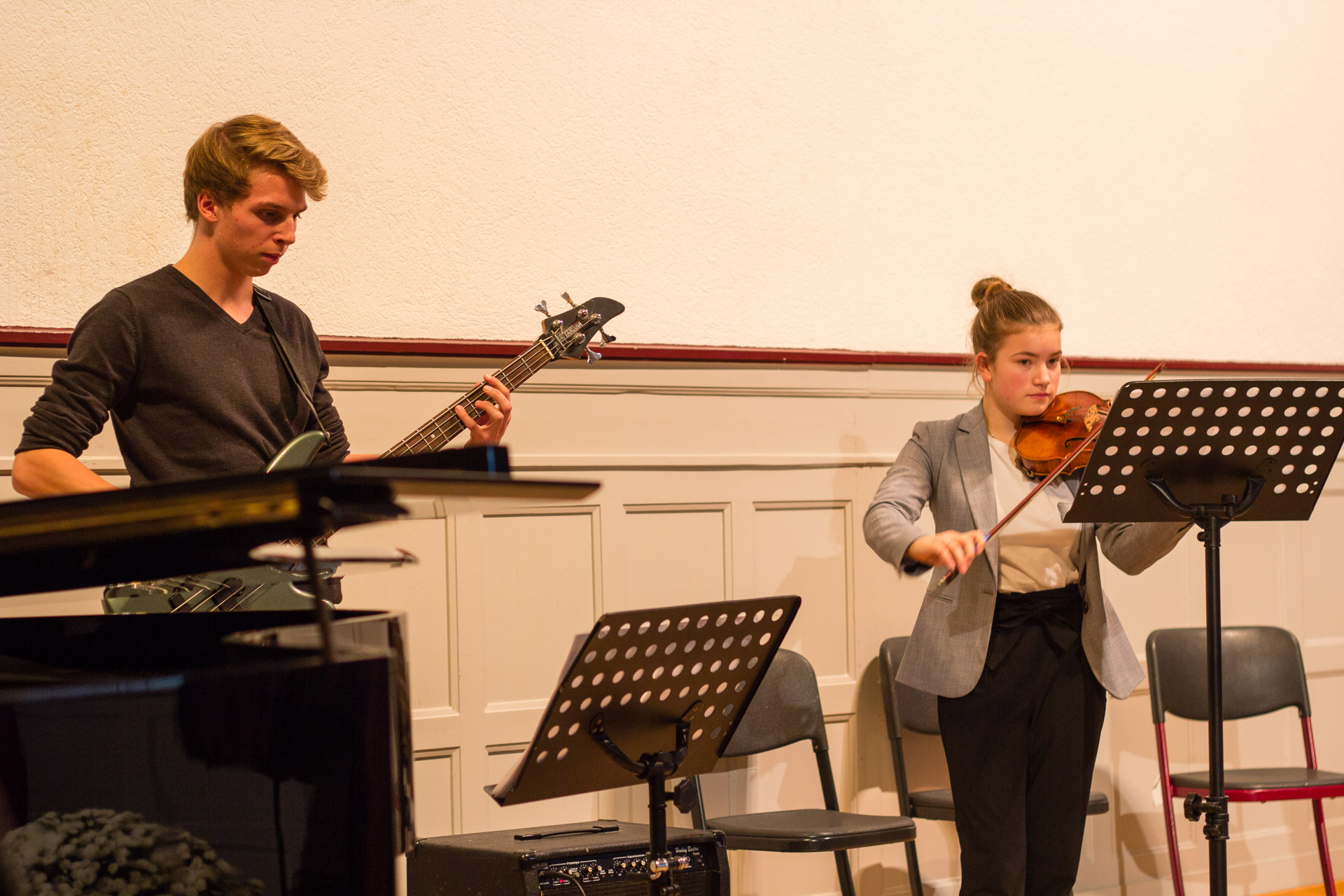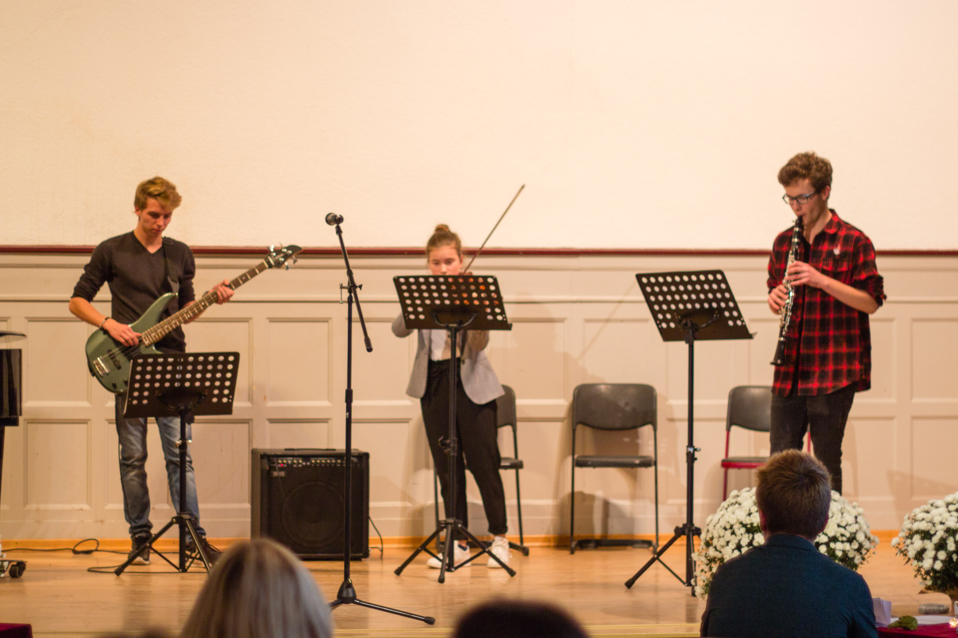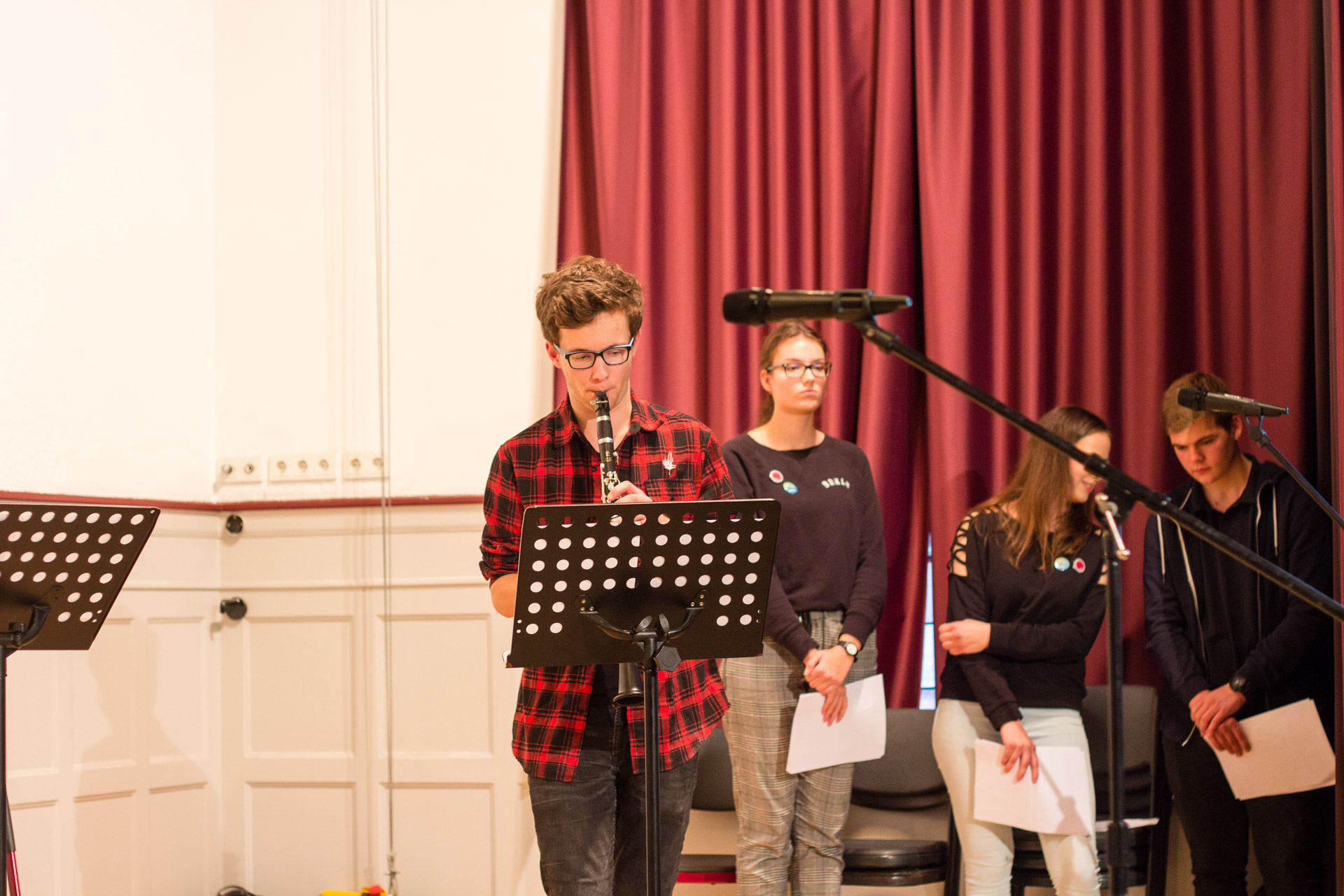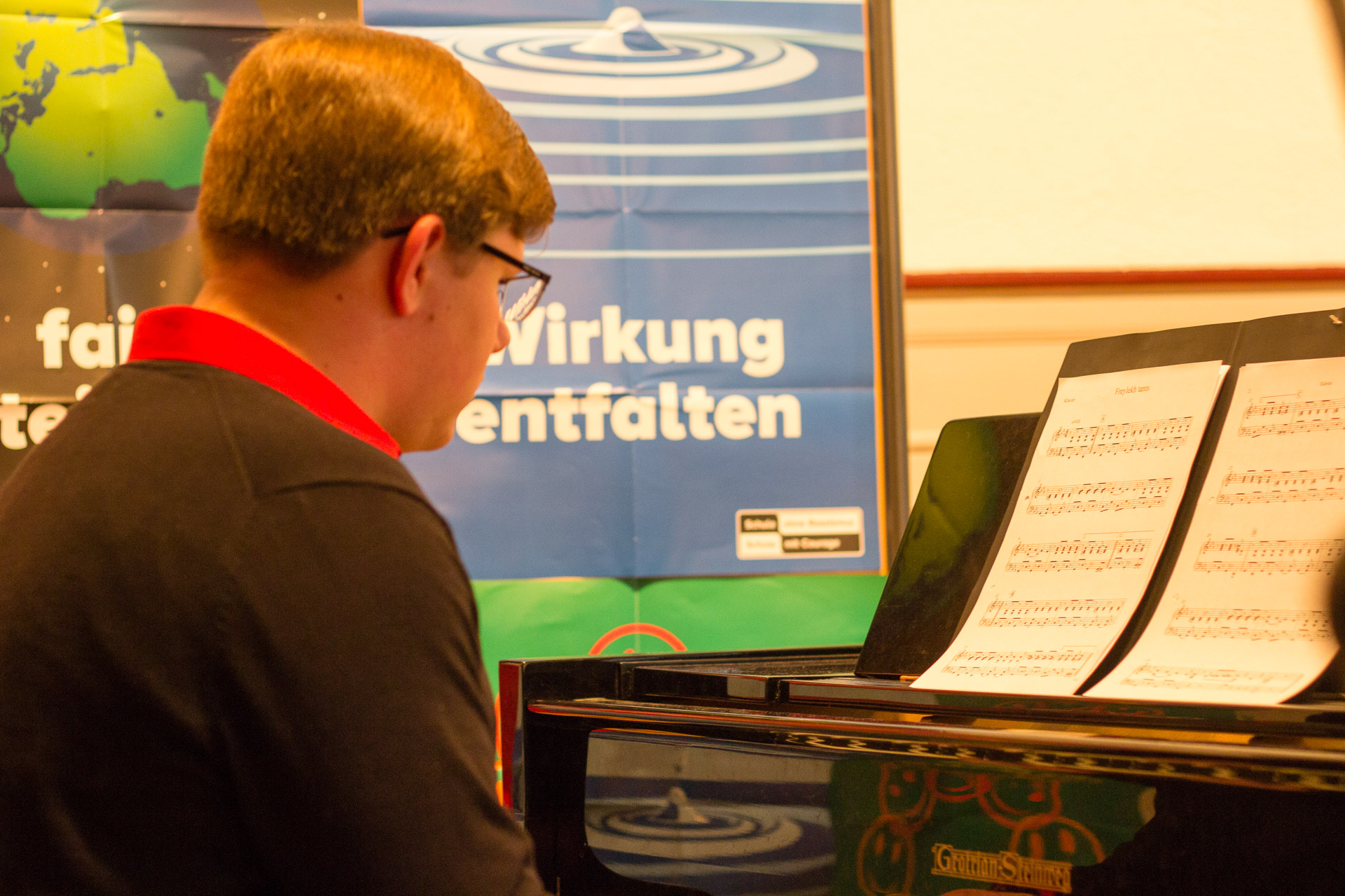 Die Theater-AG sensibilisierte mit ihrem Stück „Die Täuschung“ für Alltagsrassismus in unserer Gesellschaft und forderte mehr Mut und Zivilcourage. Der Zusatzkurs des Abiturjahrgangs präsentierte fiktionale Tagebucheinträge zum 9. November 1938, durch welche die Gefühls-und Gedankenwelt von Opfern und Tätern erfahrbar wurde. Der Geschichts-Leistungskurs der Q1 und Mitglieder des Orchesters schafften es in einer szenischen Lesung nicht nur die Originalquellen der Hattinger Reichspogromnacht in Ihrem Ausmaß und Schrecken spürbar zu machen, sondern würdigten durch Einbettung in gefühlvolle Klezmermusik die deutsch-jüdische Kultur. Das Café endete mit der symbolischen Pflanzung eines Amberbaums, der von nun als ein Symbol des Friedens wachsen soll. Der Praktische-Philosophie-Kurs der 9er-Klassen forderte die Gäste auf ihre Wünsche und Gedanken zum Frieden in den Baum zu hängen.