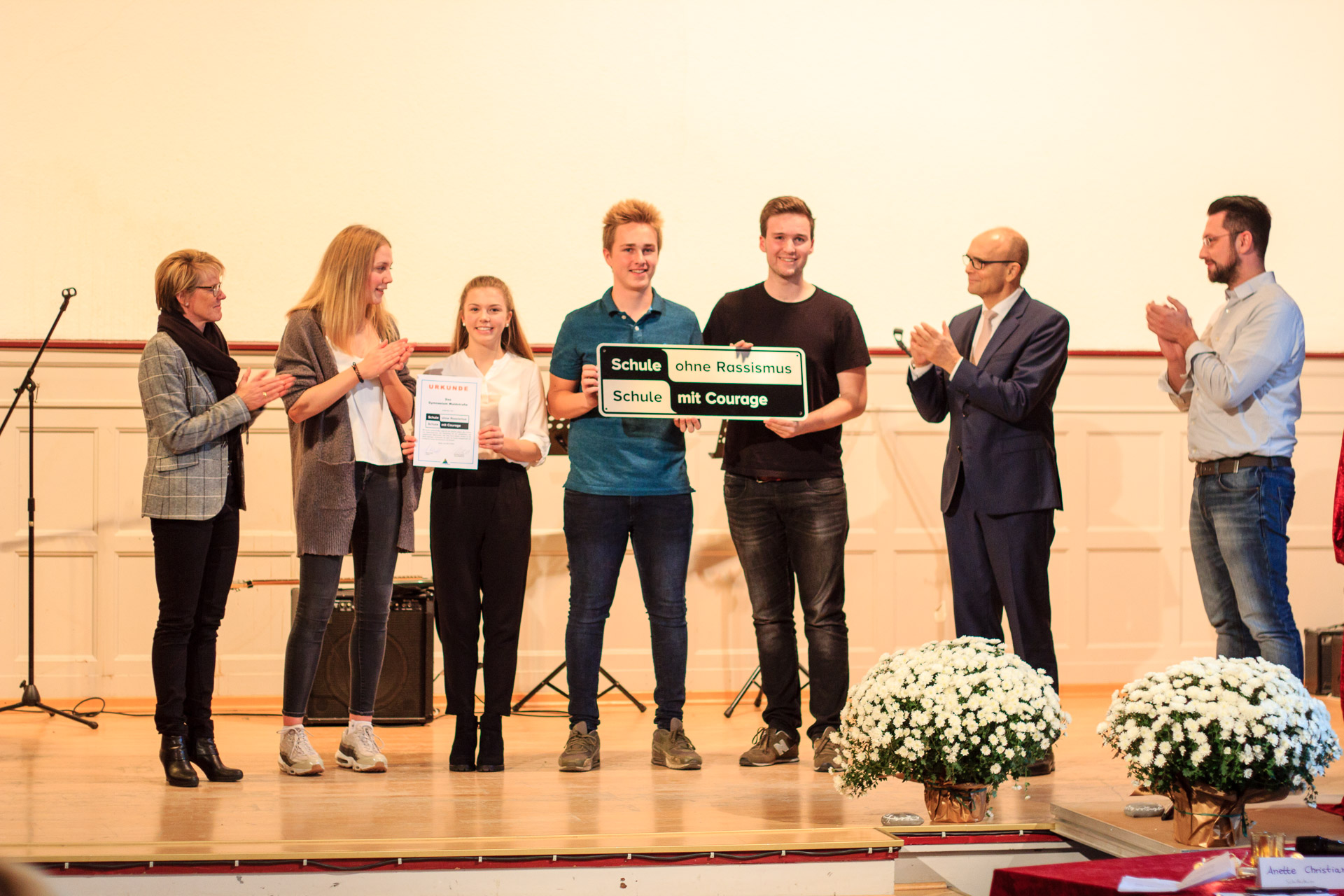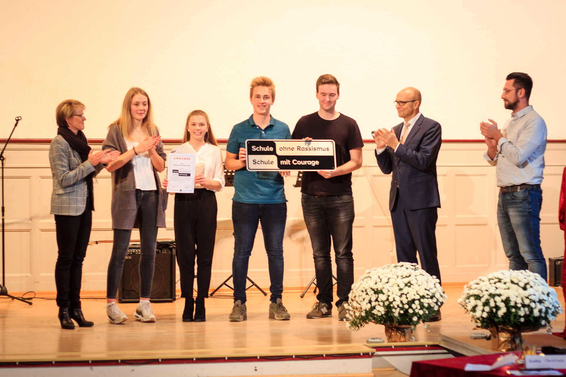 Schulpate Erwin Sellering (2. v. r.) und Armin Suceska (EN-Kreis) übereichen Schulleiterin Anette Christiani und den Schülersprechern das Siegel „Schule ohne Rassismus – Schule mit Courage“.