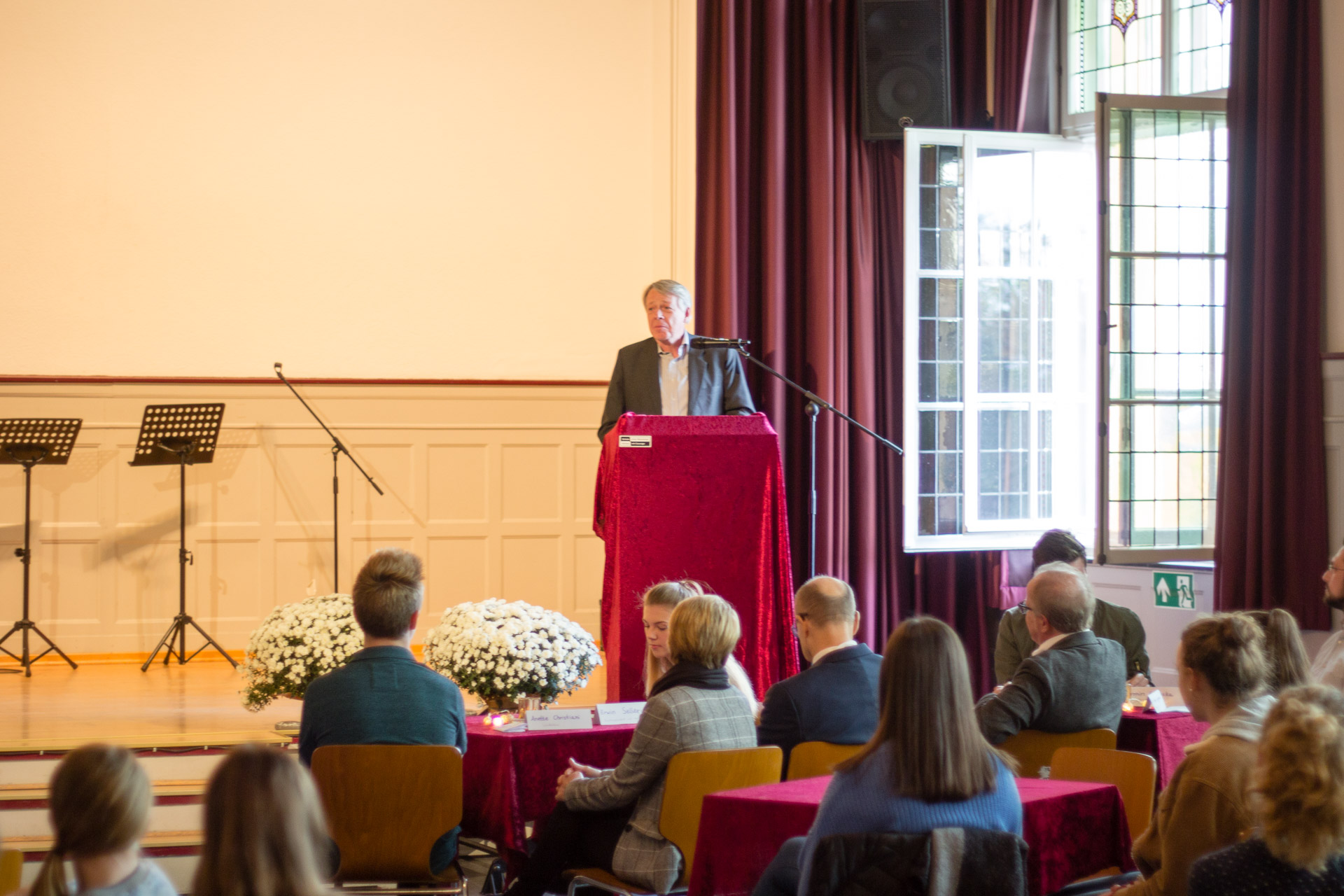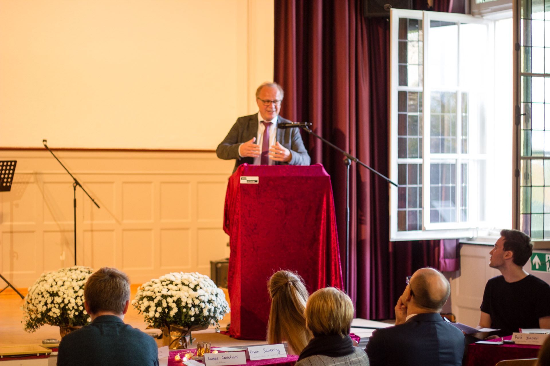 Als Ehrengast eröffnete Herr Dr. Niggemann, Historiker und Schulleiter a.D. das Café, indem er eindringlich die Schrecken des 9. Novembers 1938 erläuterte und damit auch die historische Verantwortung aller Folgegenerationen deutlich machte sich aktiv dafür einzusetzen, dass dieses nie wieder geschehen kann. Der Bürgermeister Dirk Glaser lobte das Engagement der Schule sich im Rahmen der Hattinger Gedenkwoche einzusetzen und zollte allen Beteiligten Respekt. Schulpate Erwin Sellering (ehemaliger Schüler, Ministerpräsident a.D.) erzählte aus seiner Zeit als Schüler an der Waldstraße und berichtete auch aus seiner Amtszeit als Ministerpräsident, dass die Gesellschaft immer wieder gefordert ist aktiv zu werden, um rechten Tendenzen und Stimmungen entgegenzuwirken. Er sicherte den Schülerinnen und Schülern zu sich jederzeit Zeit zu nehmen, um Unterstützung bei dieser Aufgabe zu leisten.