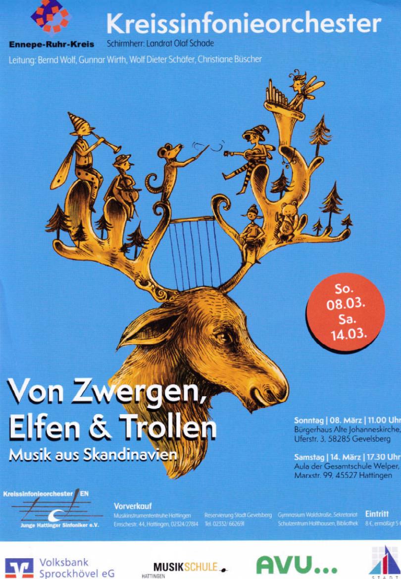 Das neue Programm, das seit Januar in intensiven Proben (darunter auch ein Workshop mit Profi-Orchestermusikern, darunter Mitglieder der Bochumer Symphoniker und des Philharmonischen Orchesters Hagen) unter der Leitung der drei Dirigenten Bernd Wolf, Gunnar Wirth und Wolf Dieter Schäfer sowie der Konzertmeisterin Christiane Büscher erarbeitet wird, steht unter dem Motto „Von Zwergen, Elfen und Trollen“ und bringt einen Querschnitt aus der skandinavischen Orchesterliteratur, u.a. mit Werken von Edvard Grieg, Jean Sibelius, Niels Gade, Carl Nielsen und Franz Berwald. Lassen Sie sich / lasst Euch überraschen!