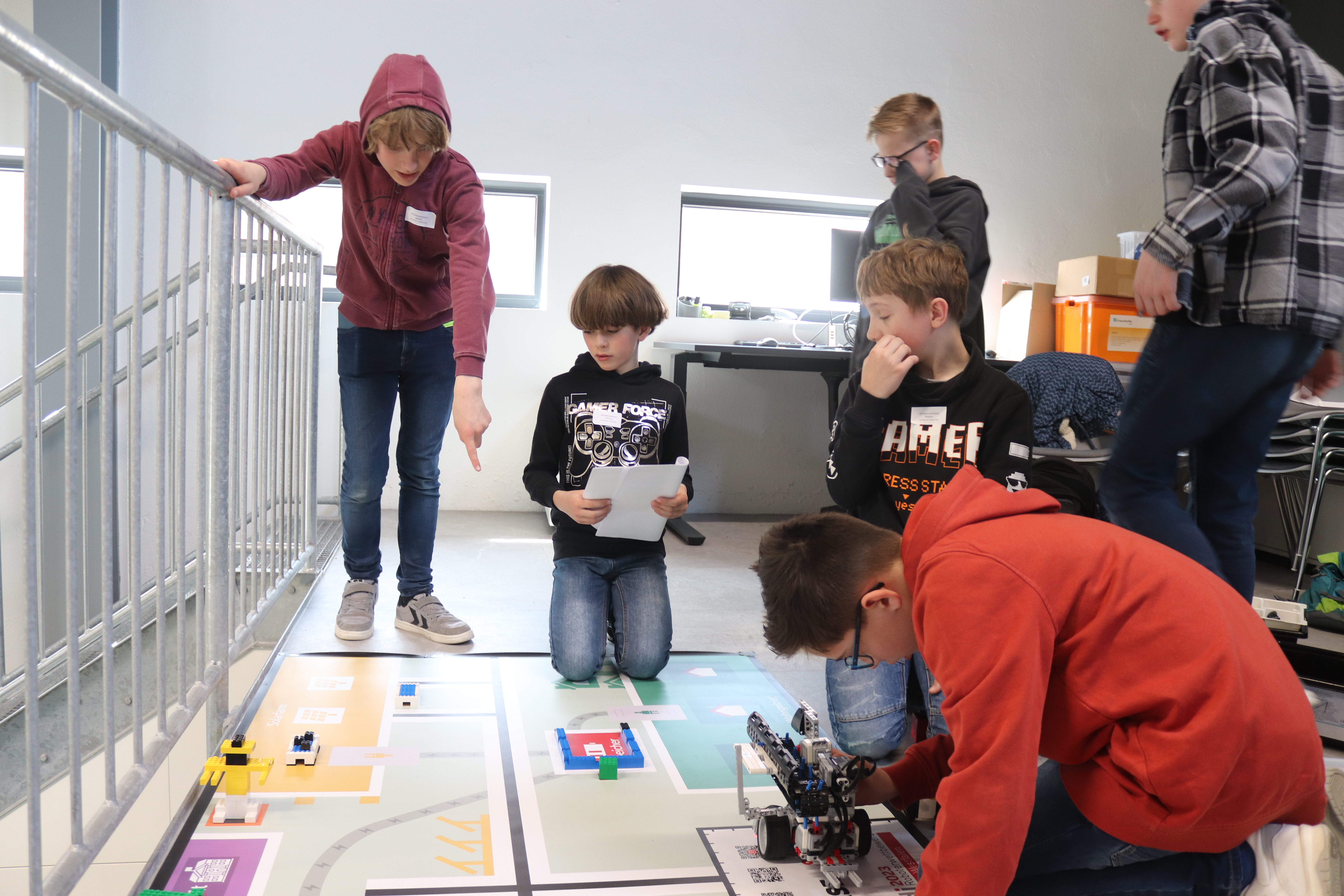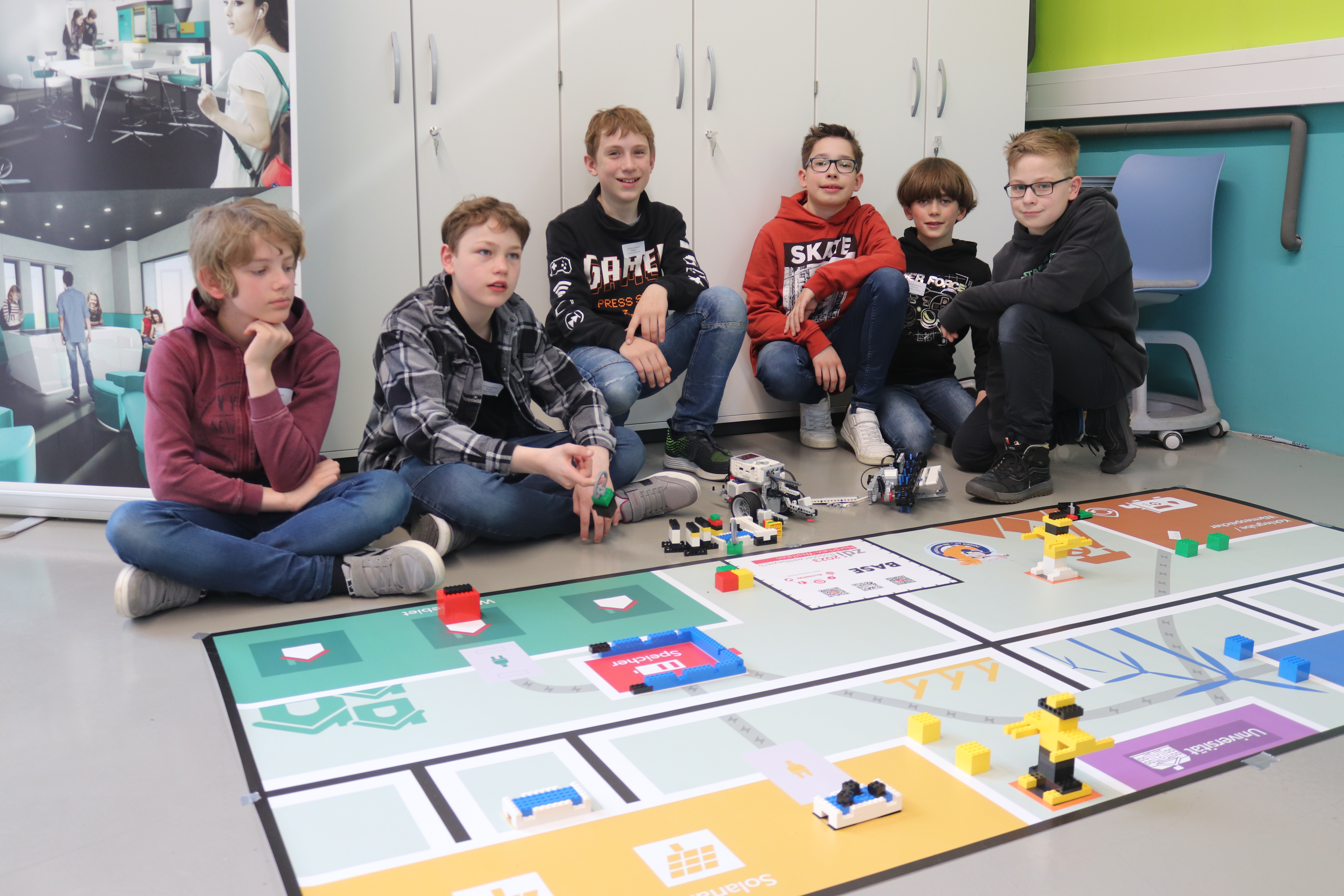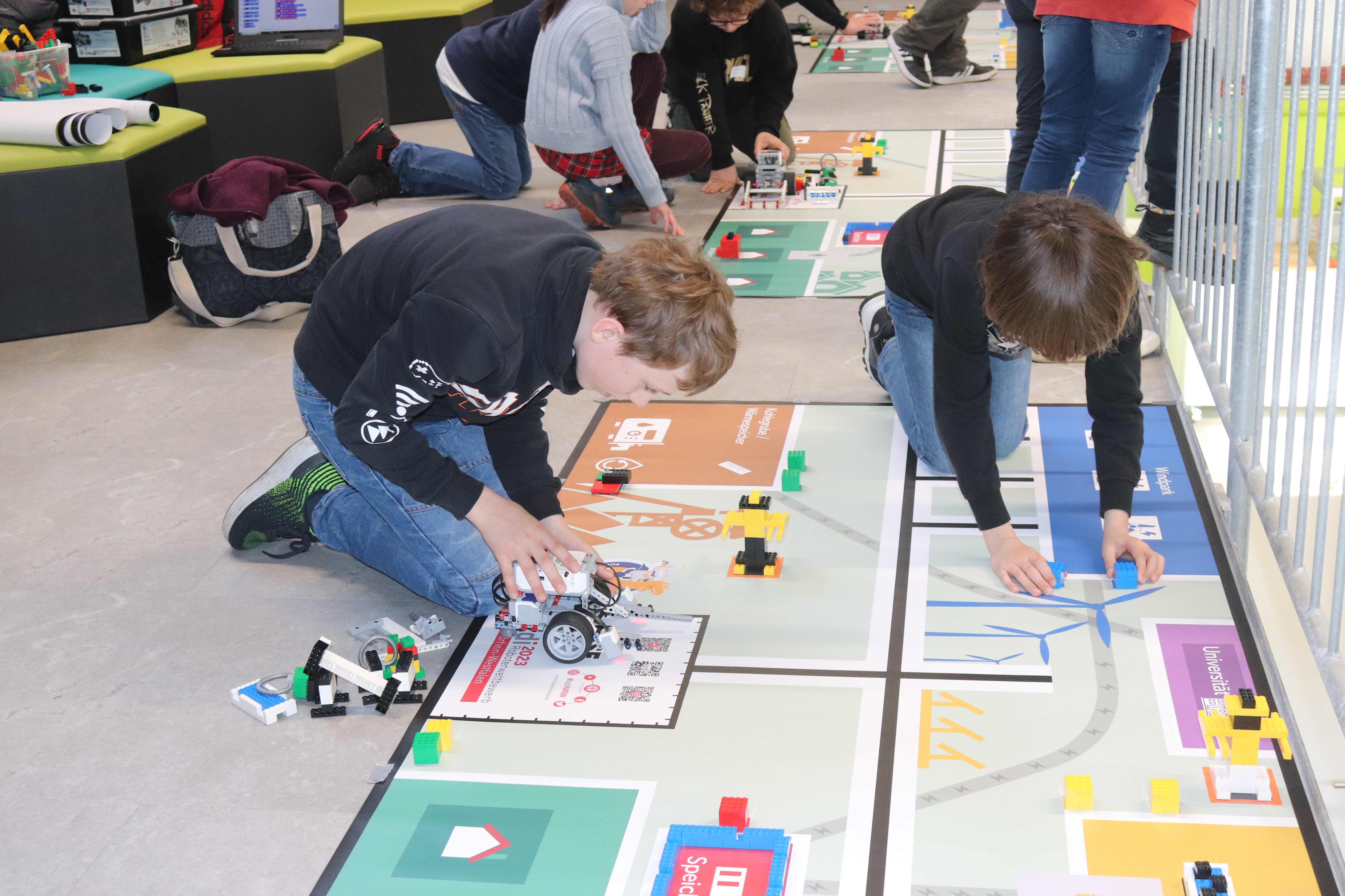 In diesem Jahr drehte sich alles um das Thema „Nachhaltige Energiewirtschaft“. Nach Veröffentlichung der Aufgaben Ende Januar entschlossen sich Robin, Jakob und Simon aus der 5a sowie Lukas, Lennox und Luke aus der 6c, sich den gar nicht so einfachen Wettbewerbsaufgaben zu stellen. So sollte der Roboter z. B. eigenständig Solarzellen reinigen, Ölheizungen aus- und dafür Wärmepumpen einbauen, Besucher in die Universität bringen, die Kohlegrube erreichen, ein Stromkabel montieren und Windräder aufstellen und das alles in einer Zeit von gerade einmal 2,5 Minuten und ohne dabei die Strommasten zu verschieben! Eine wahre Herausforderung wie sich herausstellt, da die Vorbereitungszeit trotz vieler vorgezogener AG Stunden am Ende doch viel zu knapp war und am Vortag noch längst nicht alles klappte, was man sich vorgenommen hatte. Aber zum Glück gab es ja vor dem Wettbewerb und zwischen den einzelnen Läufen immer noch etwas Zeit, die höchst effektiv dazu genutzt wurde, um mal eben noch schnell ein paar Aufgaben zu bewältigen. Nach einem erfolglosen ersten Lauf mit gerade einmal 30 Punkten, bei dem leider so einiges schief ging, drehte das Team vom Gymnasium Waldstraße richtig auf. Fast alles klappte (auch die auf den letzten Drücker noch so gerade fertig programmierten Aufgaben), so dass in den letzten beiden Läufen insgesamt 260 Punkte erzielt werden konnten, womit sich das Team vom Gymnasium Waldstraße einen sehr guten dritten Platz hinter deutlich älteren und erfahreneren Schülerinnen und Schülern und einen Glaspokal sicherte, auf den alle richtig stolz waren.