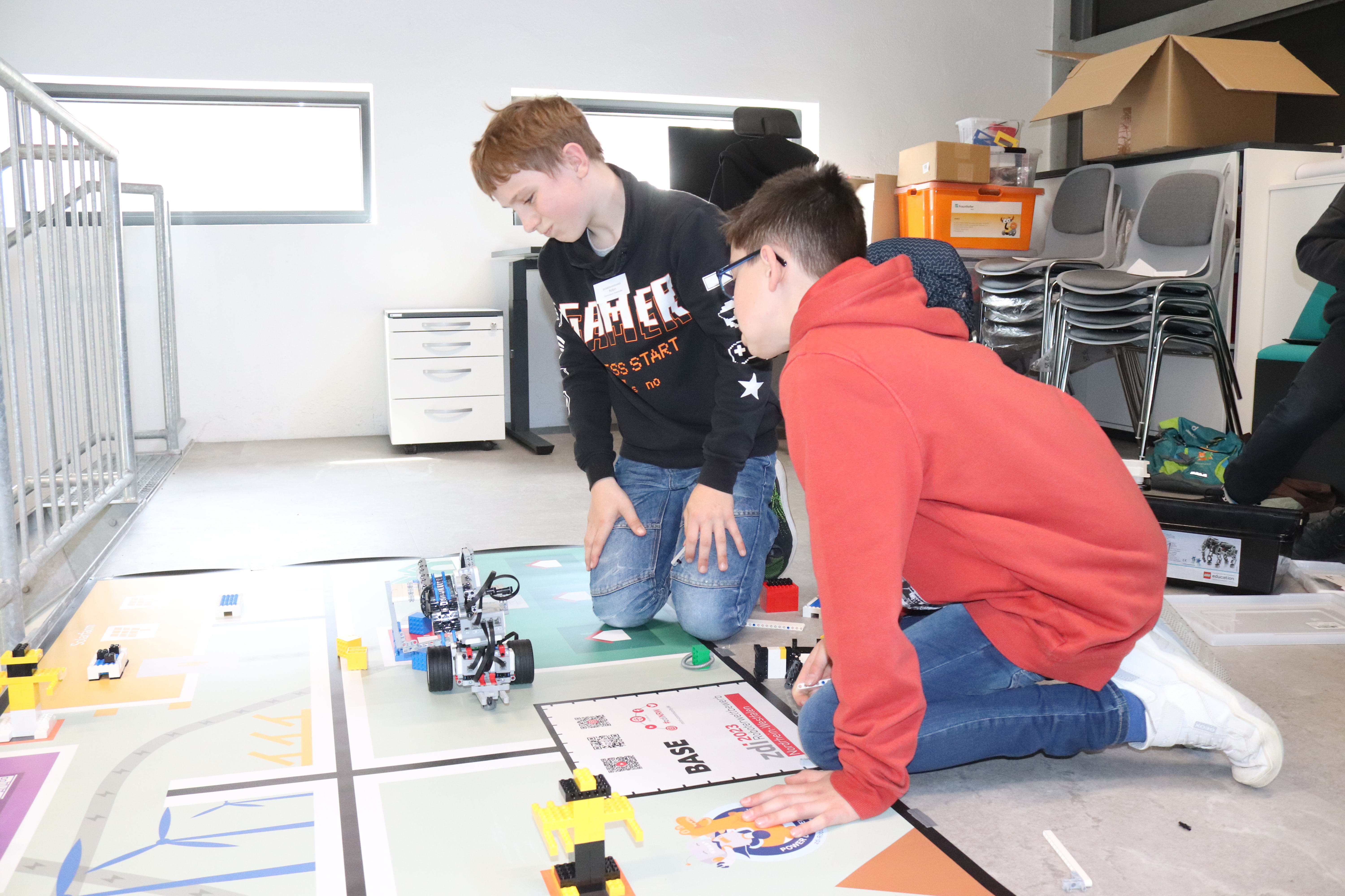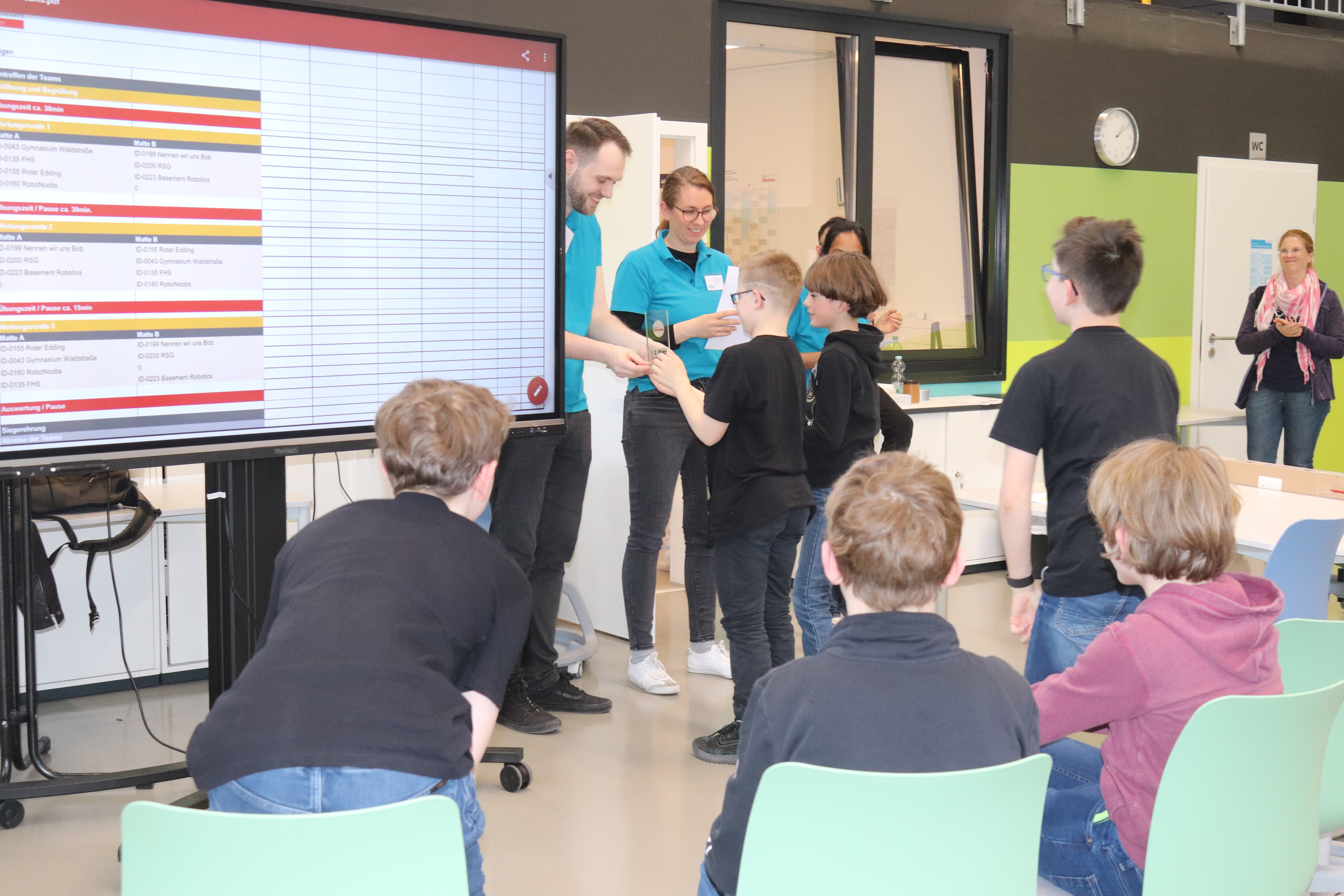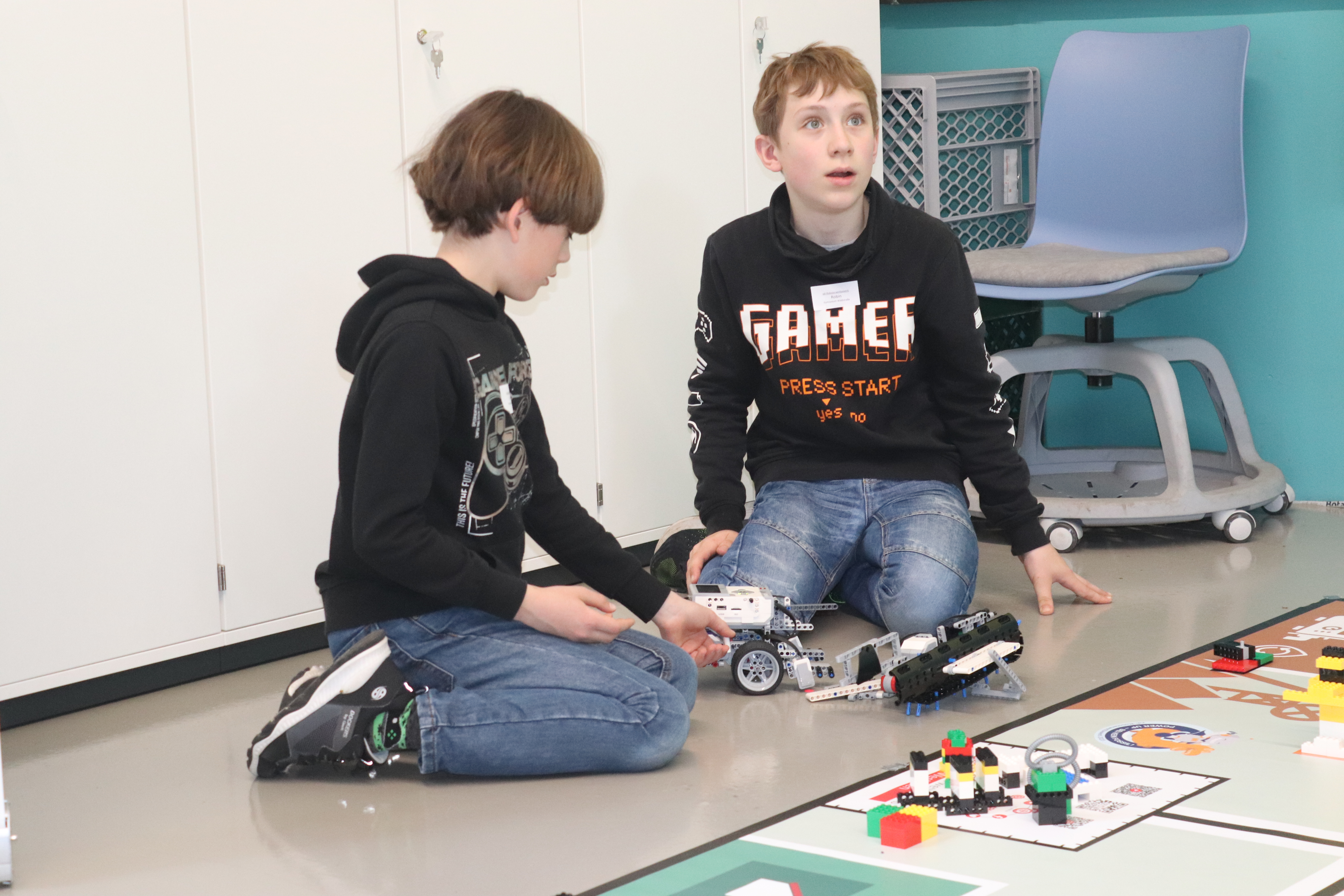 In diesem Jahr drehte sich alles um das Thema „Nachhaltige Energiewirtschaft“. Nach Veröffentlichung der Aufgaben Ende Januar entschlossen sich Robin, Jakob und Simon aus der 5a sowie Lukas, Lennox und Luke aus der 6c, sich den gar nicht so einfachen Wettbewerbsaufgaben zu stellen. So sollte der Roboter z. B. eigenständig Solarzellen reinigen, Ölheizungen aus- und dafür Wärmepumpen einbauen, Besucher in die Universität bringen, die Kohlegrube erreichen, ein Stromkabel montieren und Windräder aufstellen und das alles in einer Zeit von gerade einmal 2,5 Minuten und ohne dabei die Strommasten zu verschieben! Eine wahre Herausforderung wie sich herausstellt, da die Vorbereitungszeit trotz vieler vorgezogener AG Stunden am Ende doch viel zu knapp war und am Vortag noch längst nicht alles klappte, was man sich vorgenommen hatte. Aber zum Glück gab es ja vor dem Wettbewerb und zwischen den einzelnen Läufen immer noch etwas Zeit, die höchst effektiv dazu genutzt wurde, um mal eben noch schnell ein paar Aufgaben zu bewältigen. Nach einem erfolglosen ersten Lauf mit gerade einmal 30 Punkten, bei dem leider so einiges schief ging, drehte das Team vom Gymnasium Waldstraße richtig auf. Fast alles klappte (auch die auf den letzten Drücker noch so gerade fertig programmierten Aufgaben), so dass in den letzten beiden Läufen insgesamt 260 Punkte erzielt werden konnten, womit sich das Team vom Gymnasium Waldstraße einen sehr guten dritten Platz hinter deutlich älteren und erfahreneren Schülerinnen und Schülern und einen Glaspokal sicherte, auf den alle richtig stolz waren.
