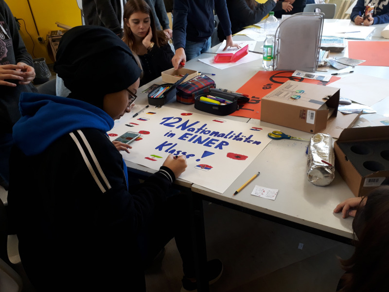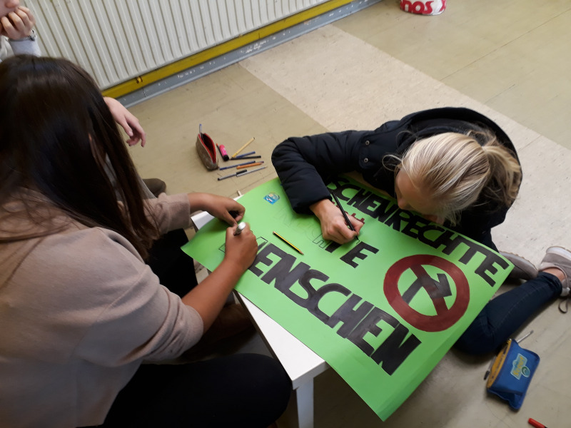 Workshop der SV: Schülerinnen und Schüler diskutieren gemeinsam und entwerfen Plakate für den Sternenmarsch.