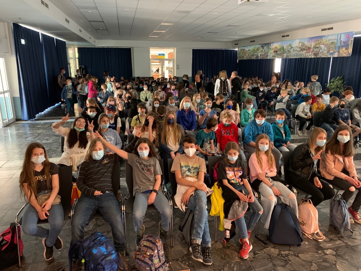 Die Schülerinnen und Schüler der Klassen 5c, 5d und 5e, sowie die SchülerInnen der Europa- und der Musik-AGs des Gymnasiums Waldstraße waren heute, am 09. Mai 2022 in die Bochumer Hellweg Schule eingeladen. Anlass war die gemeinsame Feier des Europatags 2022, die die EuropakoordinatorInnen des Netzwerks Europaschulen geplant hatten.