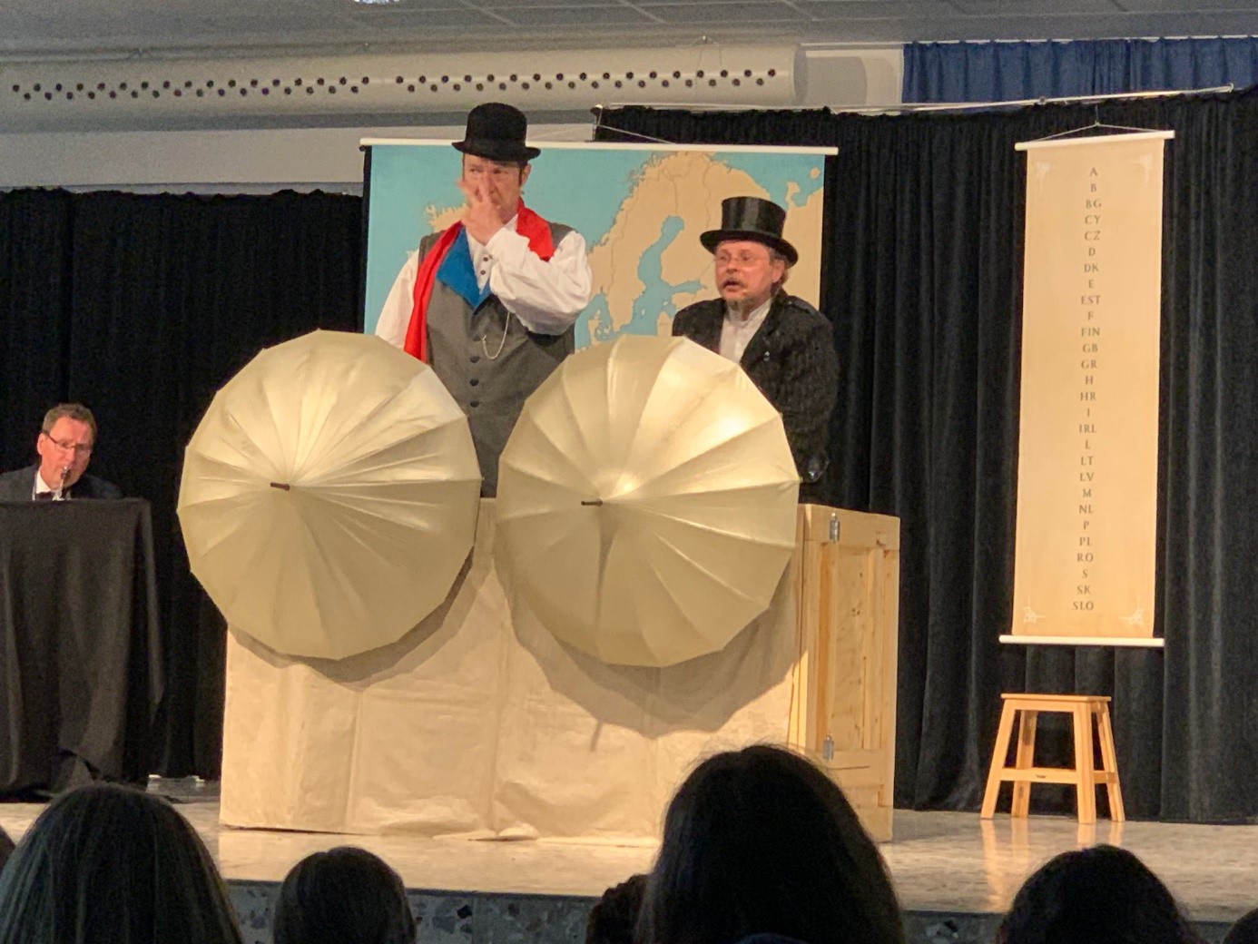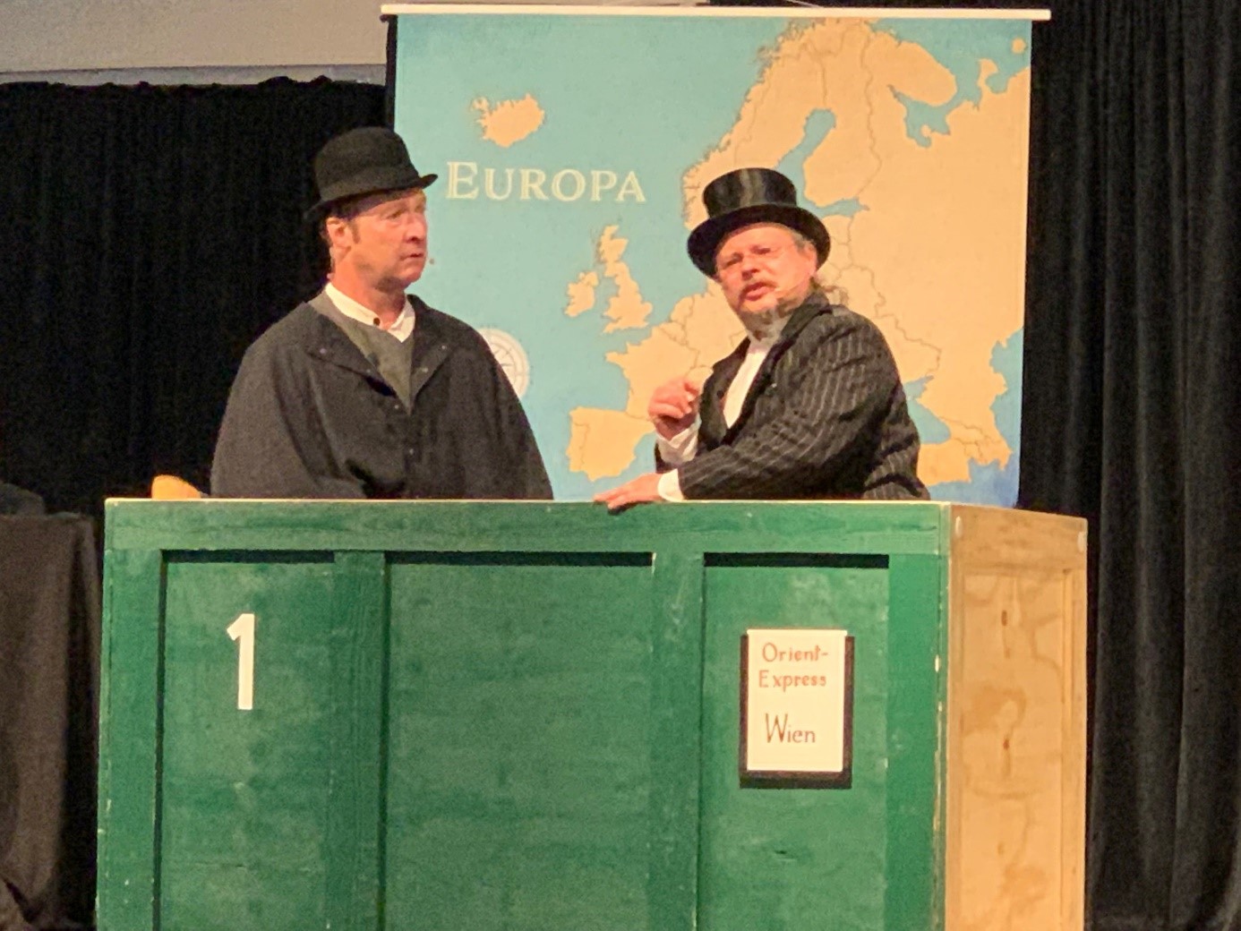 Frei nach Jules Verne wurde darin die Geschichte „In 80 Tagen um die Welt“ fortgeführt: Phileas Fogg und sein Diener Passepartout mussten in nur 28 Tagen alle Länder Europas bereisen, um ihre Wette zu gewinnen. Das geschah alles sehr unterhaltsam und lustig und es wurden viele europäische Orte und Persönlichkeiten besucht! Untermalt wurde die kurzweilige Aufführung von verschiedenen nationaltypischen Melodien, bei denen das Publikum mit „Olé!“ in Spanien und Klatschen beim griechischen Sirtaki mitwirken durften.