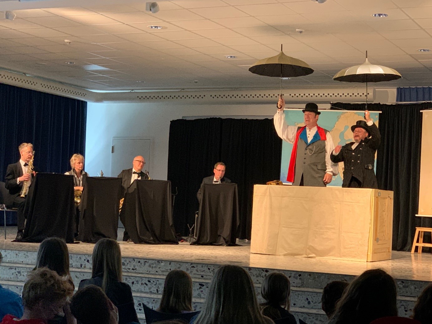 Wir starteten in der dritten Stunde und kamen nach einer „aufregenden“ Reise mit den öffentlichen Verkehrsmitteln schließlich um 11.30 Uhr an der Hellweg Schule an. Von weitem sahen wir schon die blauen und gelben Europaballons, die über dem Eingang zur Aula aufgehängt worden waren. Drinnen begrüßte uns der Schulleiter Herr Balliet sehr herzlich und dann ging es auch schon los mit dem Stück „In 28 Tagen durch Europa“ des Ensembles Pindakaas, bestehend aus einem Saxophon-Quartett und zwei Schauspielern.