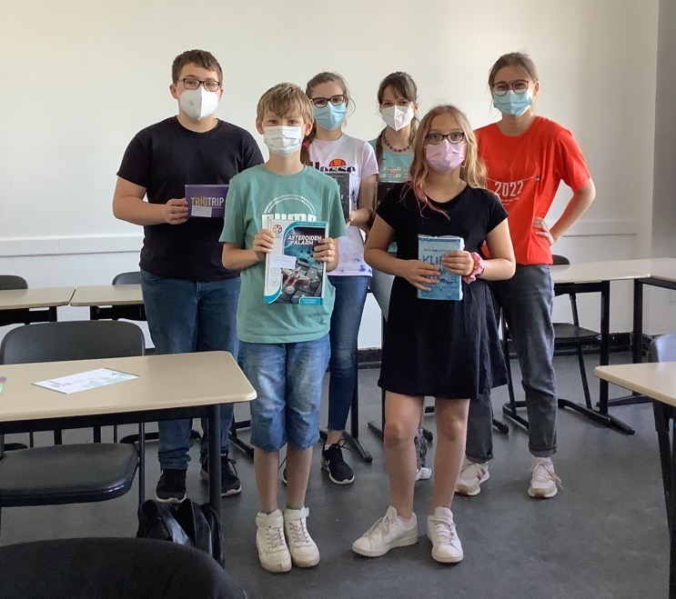 Jede*r Teilnehmer*in erhält eine Urkunde, ein Lösungsheft und ein kleines Knobelspiel. Vier Schülerinnen und vier Schüler waren besonders erfolgreich und werden dafür mit Sonderpreisen ausgezeichnet (auf dem Foto unten von links nach rechts): Kasimir (9b), Joshua (5e), Alina und Mareike (beide 8a), Isabelle (5e) und Sophie (Q1), nicht auf dem Foto: Robin (5a) und Phil (5e).
