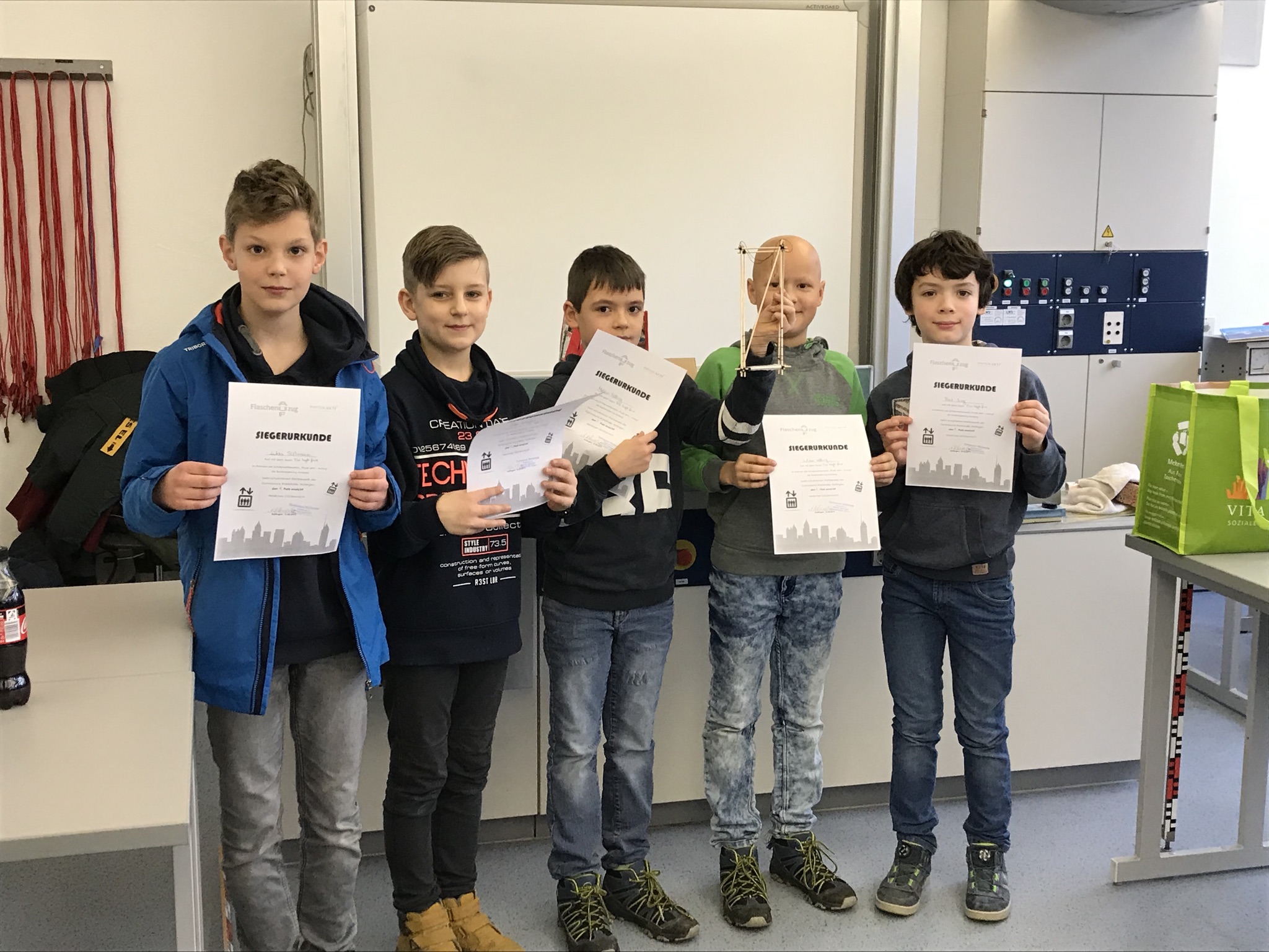 Preis Klasse 5b "Die High Five" mit Rafael Michalski, Melvin und Julian Velling, Raik Jung und Lukas Süßman bei einem Gewicht von 0,14 N,