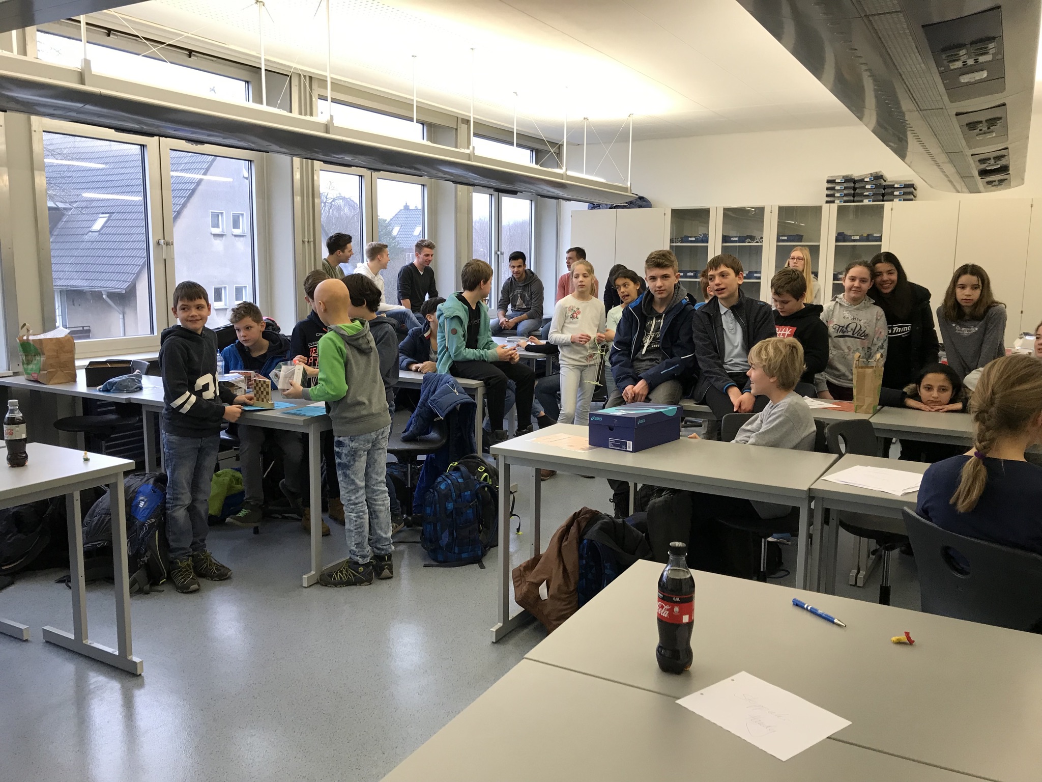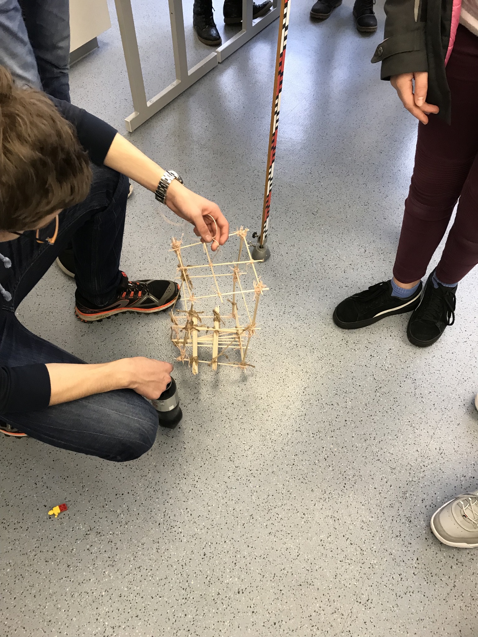 Nur aus Bindfaden und Holzspießen (Schaschlikspieße Klassen 6-7, Zahnstocher Klassen 7-8) musste eine möglichst leichte Aufzugskabine erbaut werden, die eine vorgegebene Ladung, eine gefüllte 0,5l-Kunststoffflasche, einen Meter in 5 s hoch- und runter transportieren kann, ohne sich selbst zu verändern.