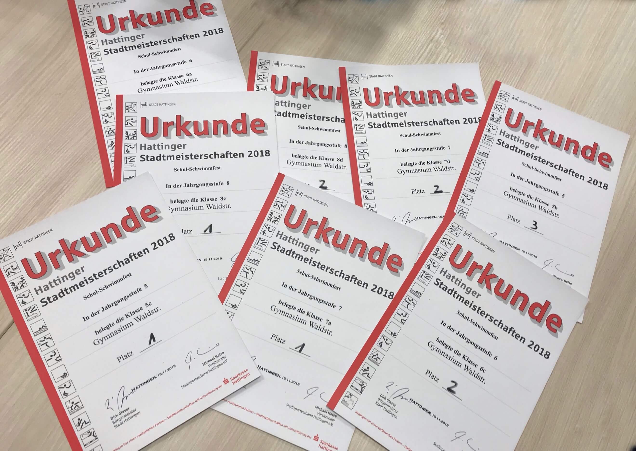 Das Gymnasium Waldstraße war dieses Jahr mit 8 Klassenstaffeln der Jahrgangsstufen 5-8 vertreten. Unsere Schwimmerinnen und Schwimmer haben alles gegeben und tolle Ergebnisse erzielt. Dieses Jahr haben gleich drei unserer Staffeln die Stadtmeisterschaft an die Waldstraße gebracht. Einen riesigen Glückwunsch an die Klassen 5c, 7a sowie 8c. Die Klassenstaffeln der 8d, 7d sowie 6c haben den zweiten Platz aller weiterführenden Schulen Hattingens belegt. Die Klasse 5b erreichte den dritten Platz und die 6a den vierten Platz.