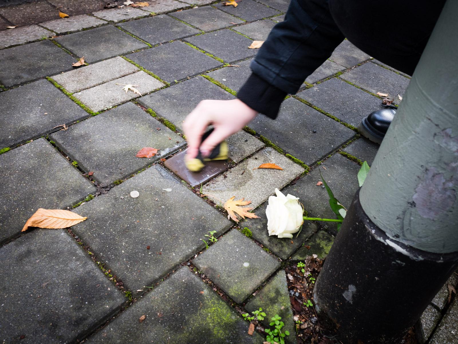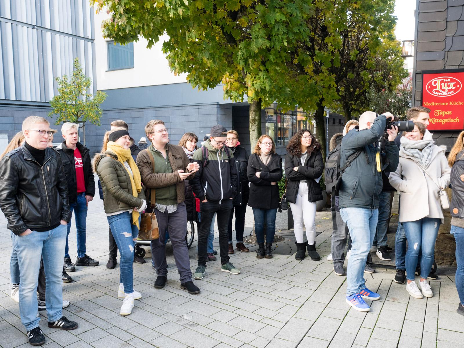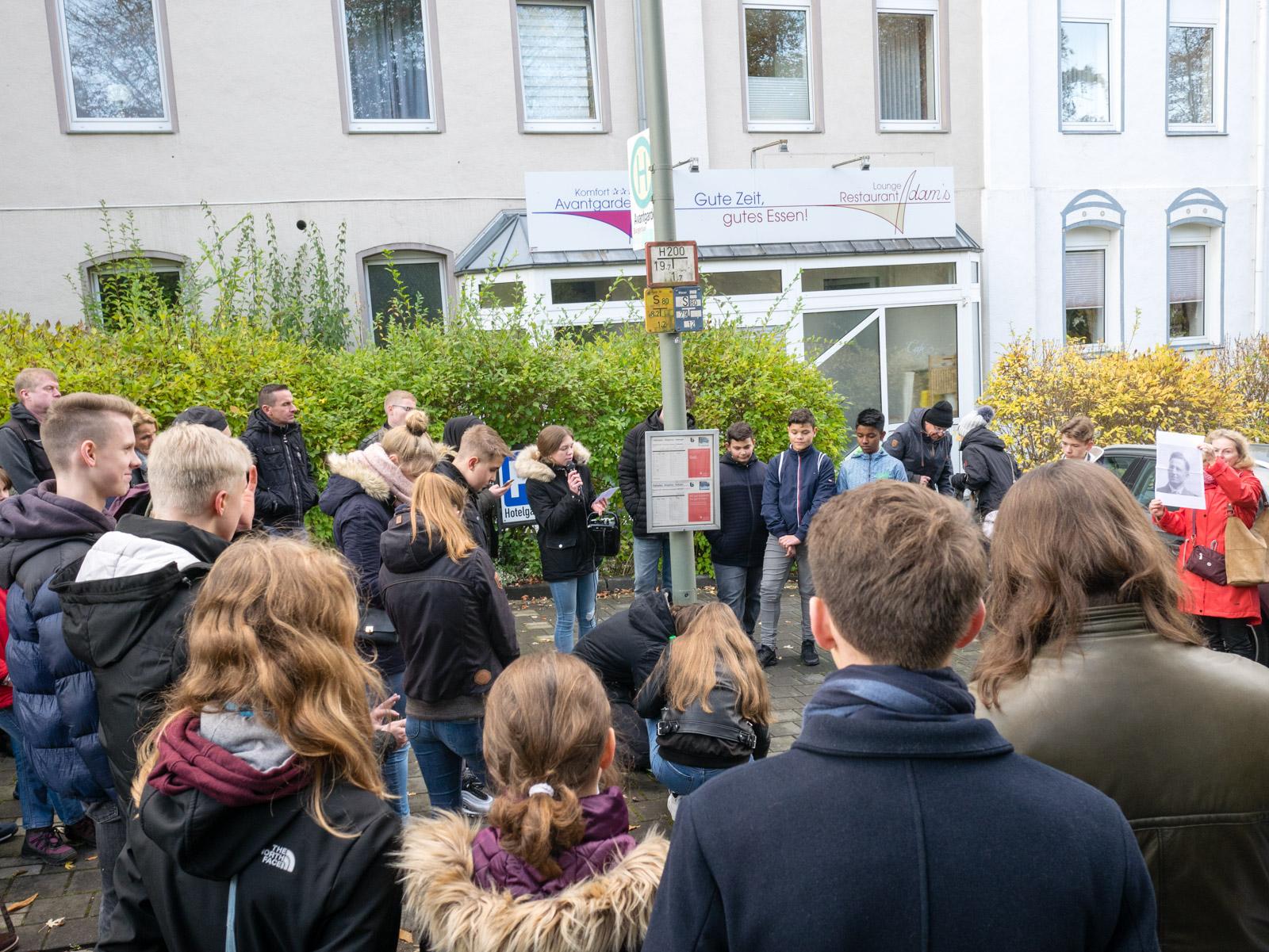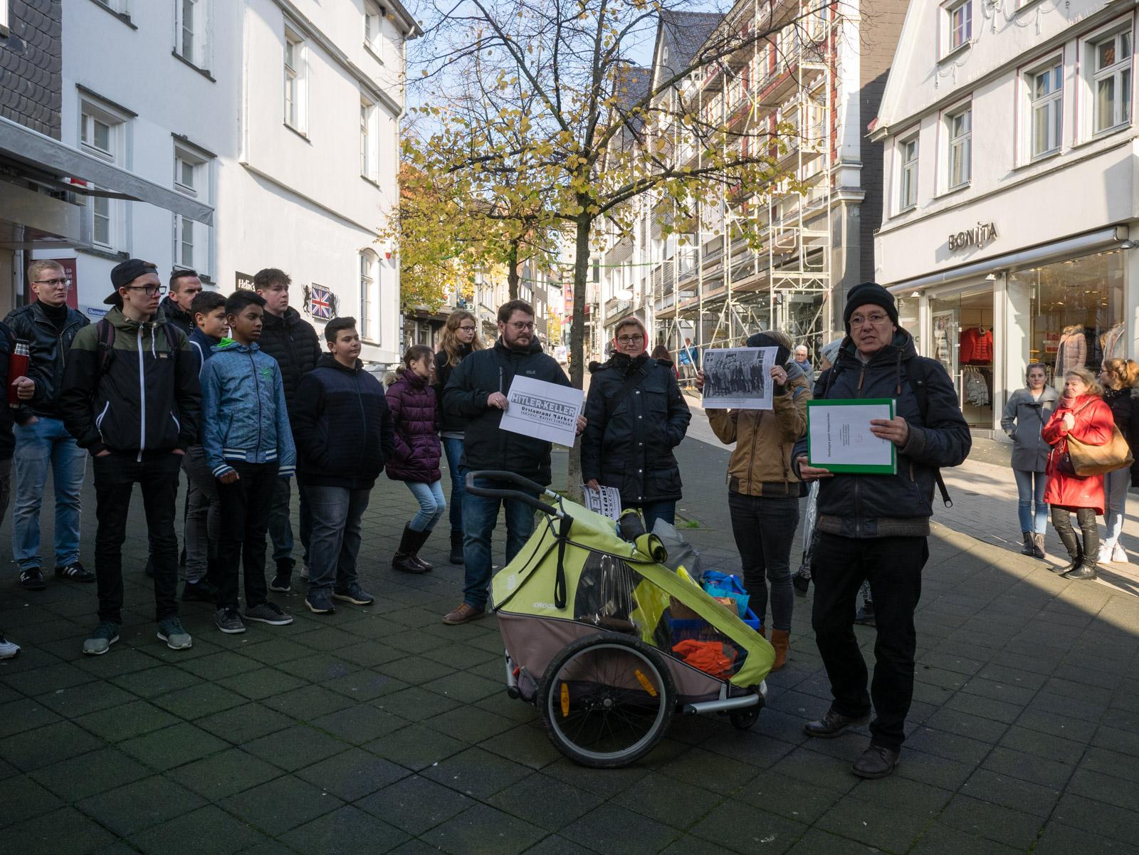 Während der Aktion berichtete Herr Weiss zwischenzeitlich mehrere interessante historische Fakten zu der NS-Zeit spezifisch in Hattingen, wie z.B. über das Arbeits- und Umerziehungslager an der Henrichshütte oder den sogenannten „Hitler-Keller“, der sich im heutigen Cafe Mexx befand. Dazu zeigte er originale Bilder der jeweiligen Orte, sowie zu den Opfern an jeder Station.