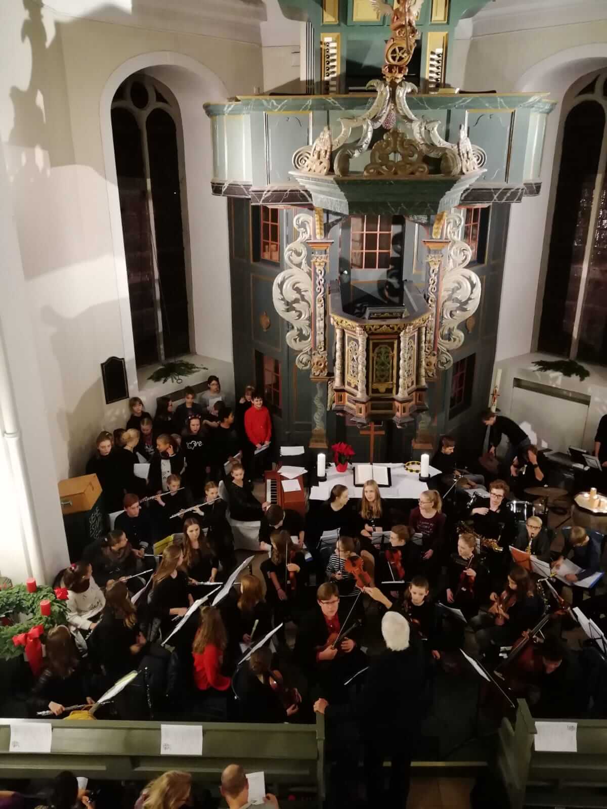 Wir blicken auf zwei sehr stimmungsvolle und erfolgreiche Weihnachtskonzerte zurück. In der ev. Kirche Blankenstein in der "Blankensteiner Abendmusik" (30.11.) und in der St. Georgskirche (11.12.) spielten die Vokal- und Instrumentalgruppen unserer Schule - Chor, Orchester, Jazzband, Unterstufenspontanchor (nur St. Georg) sowie der Kammerchor "Wie_Waldi.chor" aus Ehemaligen, Eltern und Kollegen - und einige begabte Solisten aus Kreisen der Schülerschaft ein abwechslungsreiches Programm aus verschiedenen Zeiten und Stilrichtungen. Das Foto entstand beim Blankensteiner Konzert.