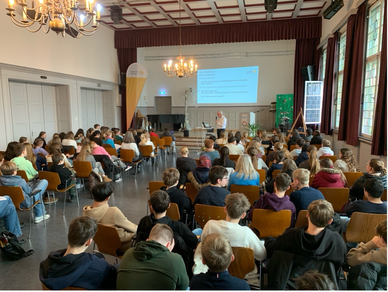 Die 7. und 8. Klässler erhielten von Christian Partes von den Stadtwerken tiefere Einblicke in die CO2-Emissionen, die mit unserem Stromverbrauch in der Schule, aber auch zu Hause entstehen. Der Fokus wurde hier vor allem auf unser aller Handy-, Tablet- und Computernutzung gelegt. Am Ende sammelten die SchülerInnen hilfreiche Vorschläge, um Energie bei der Mediennutzung zu sparen.