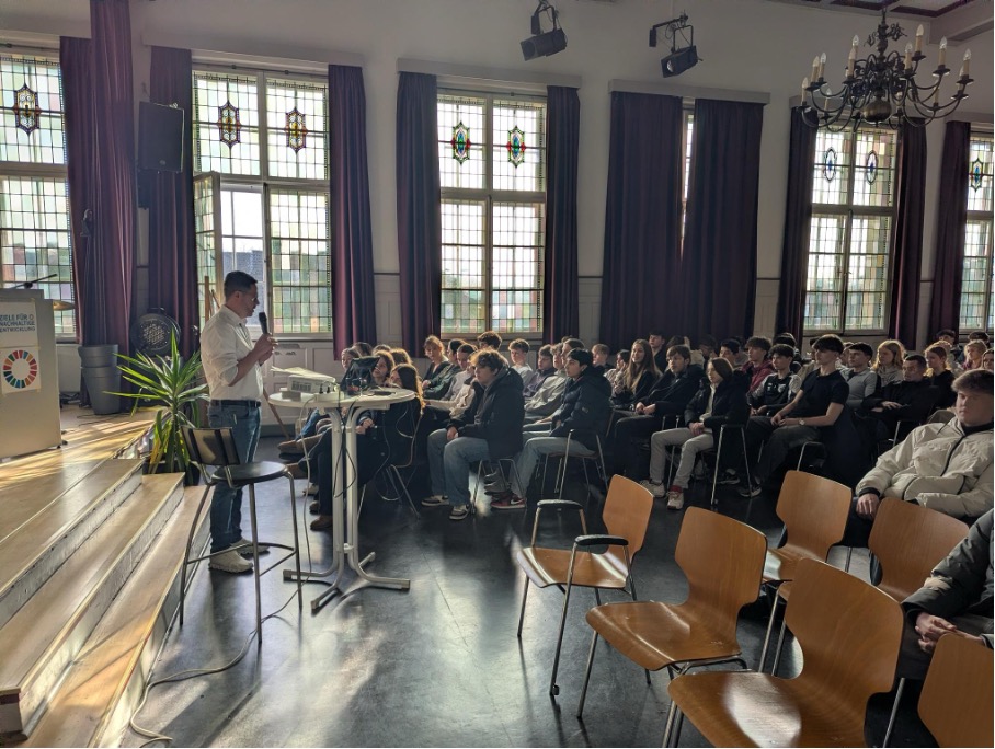 Inhaltliche Grundlage bildeten die 17 Nachhaltigkeitsziele der Vereinten Nationen, an denen sich alle Angebote des Tages orientierten. Im Vormittagsbereich nahmen nahezu alle Jahrgänge unserer Schule – mit Ausnahme des 9. Jahrgangs und der Q1, die parallel an anderen Projekten arbeiteten – an jahrgangsspezifischen Vorträgen in der Aula teil.