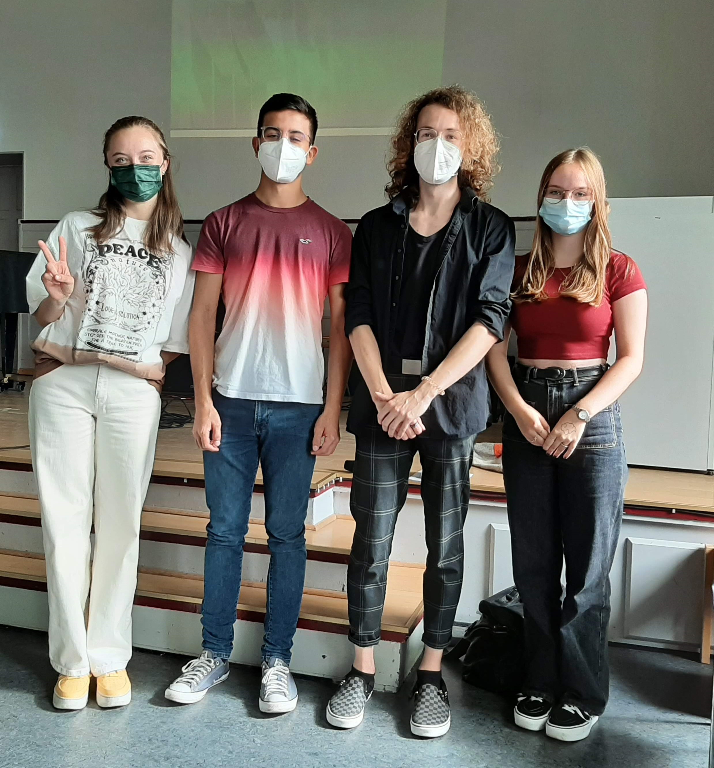 Wir präsentieren stolz unser neues Schülersprecher_innen-Team: Linda, Flori, Cameron (alle Q2) und Maja (EF)